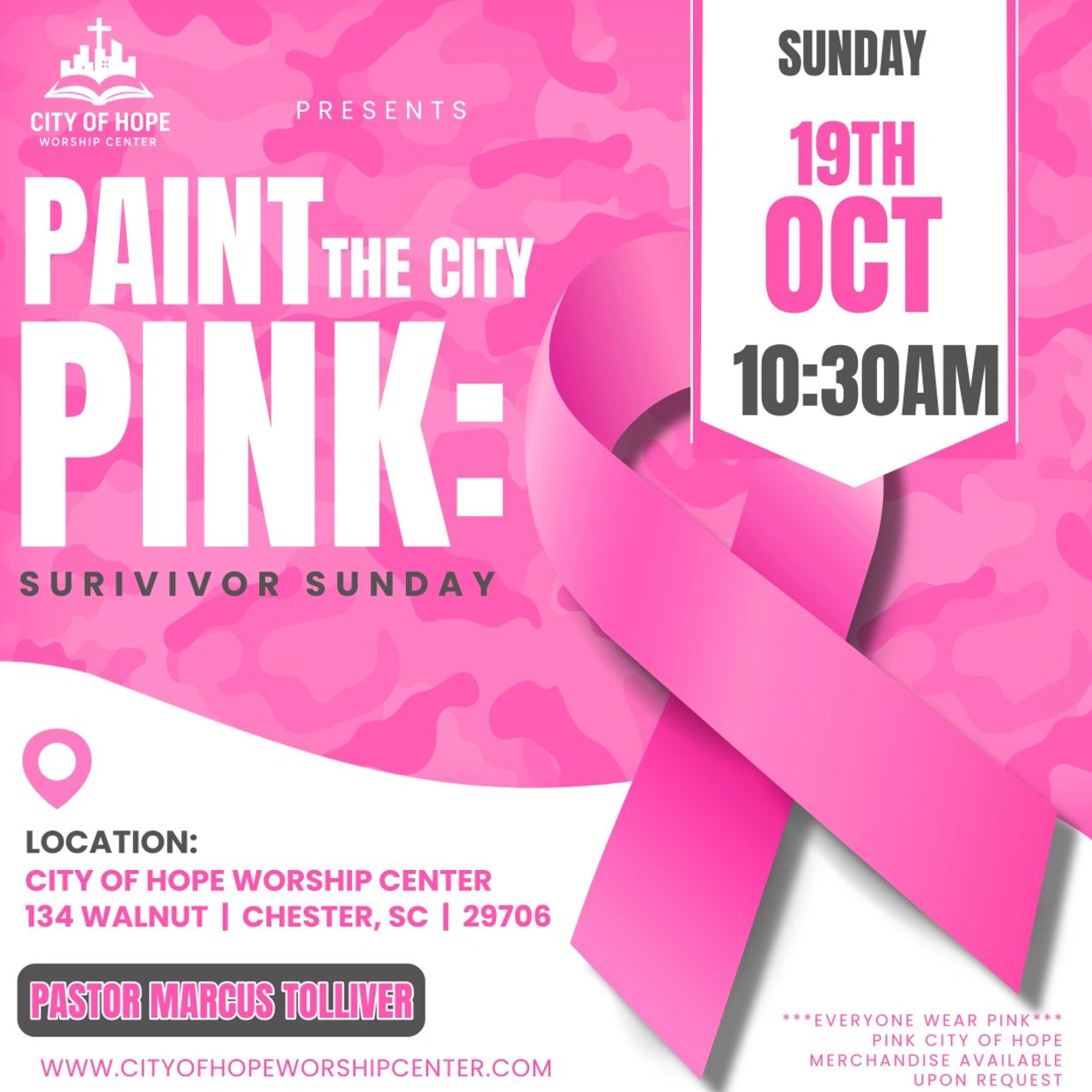 Wear your pink attire and help us Paint the City Pink in honor of those who have fought, survived, and continue to inspire us every day. Together, we’ll lift our voices in worship, share stories of hope, and stand united in love and support. Let’s make this a day of faith, remembrance, and celebration because at The City of Hope, we believe in healing, hope, and victory!